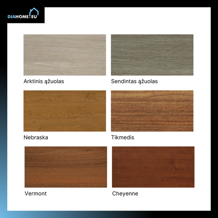 Spalvų pasirinkimas: Platus spalvų spektras, įskaitant medžio imitacijos dekorus.